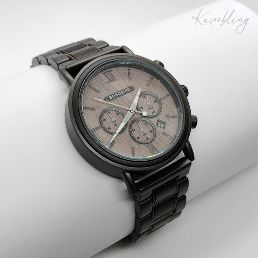 Gold trim, Ebony and Black Stainless Steel Men's Wooden Watch