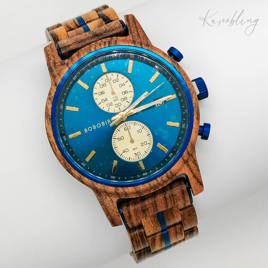 Natural Wenge Wood and Blue Stainless Steel Men's Wooden Watch